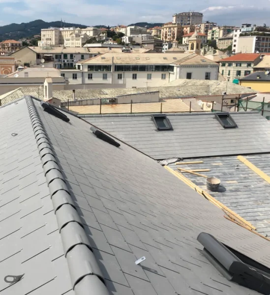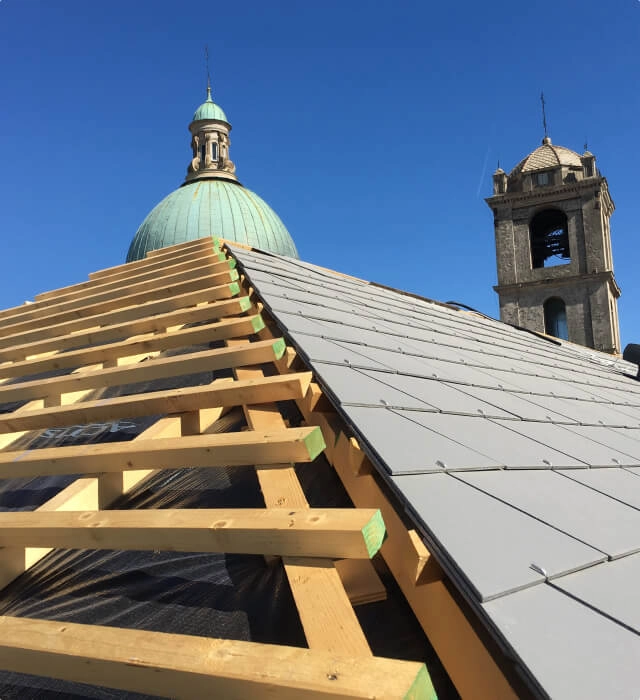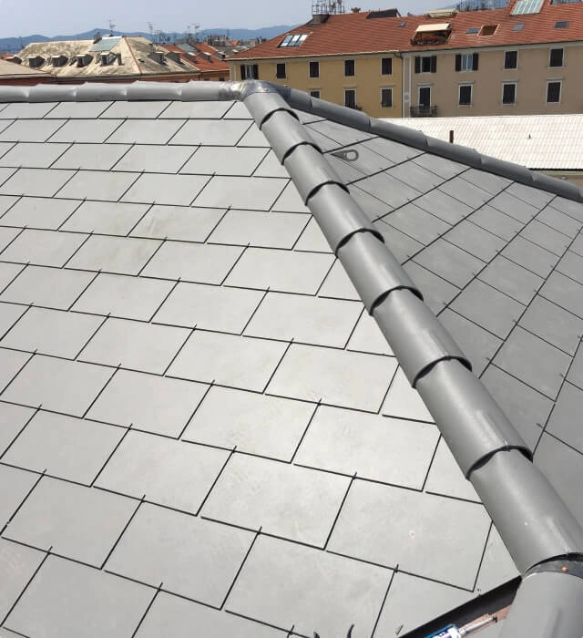 Il palazzo del Capitolo della Cattedrale di Savona presentava un tetto in lastre di ardesia naturale di colore chiaro. La ristrutturazione della copertura richiedeva l’impiego di un materiale leggero e che rispettasse i vincoli di natura ambientale esistenti. Le lastre Swisspearl in ardesia sintetica di colore grigio chiaro hanno sostituito quelle naturali conservando il tradizionale aspetto esteriore dell’edificio.