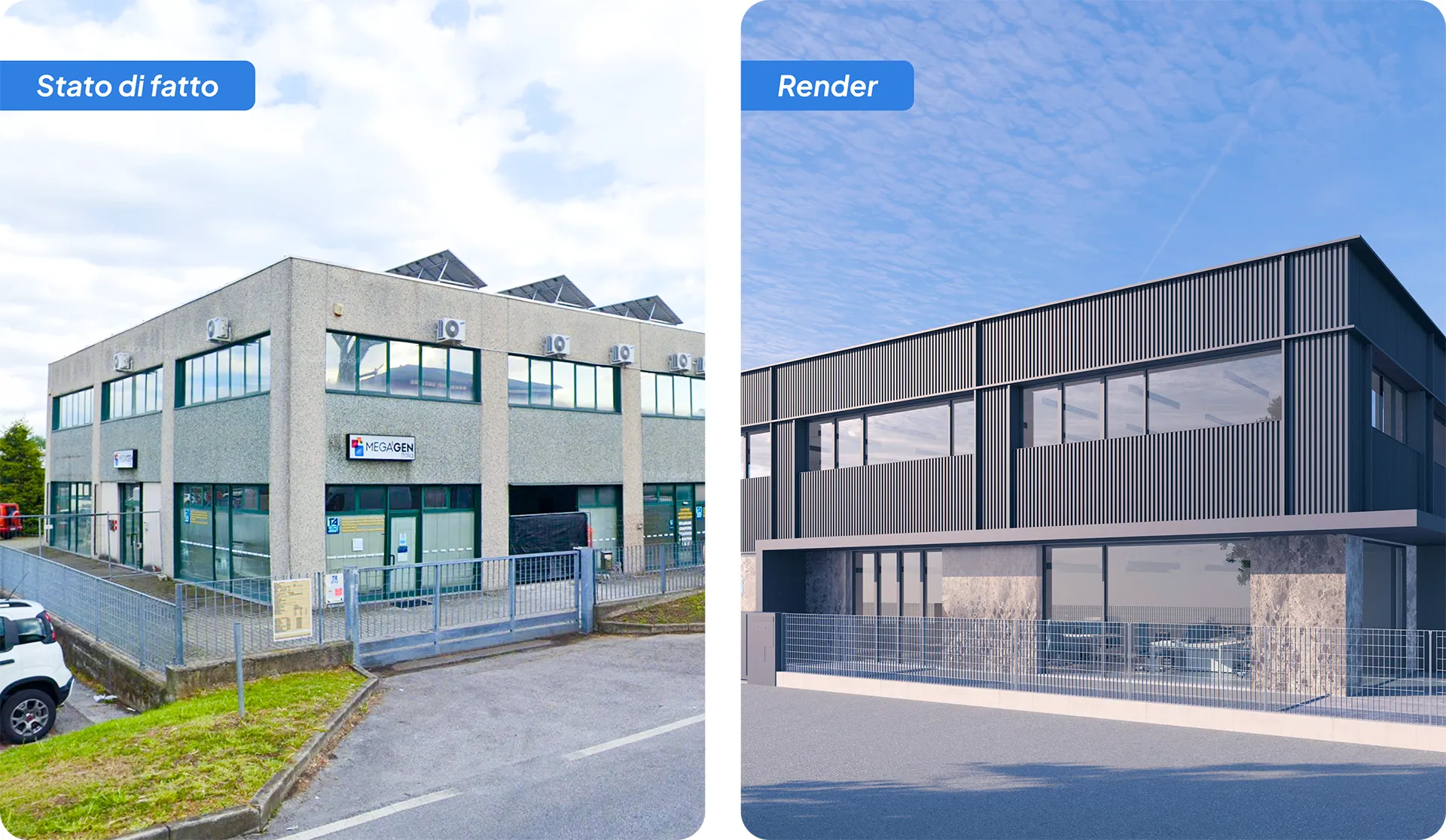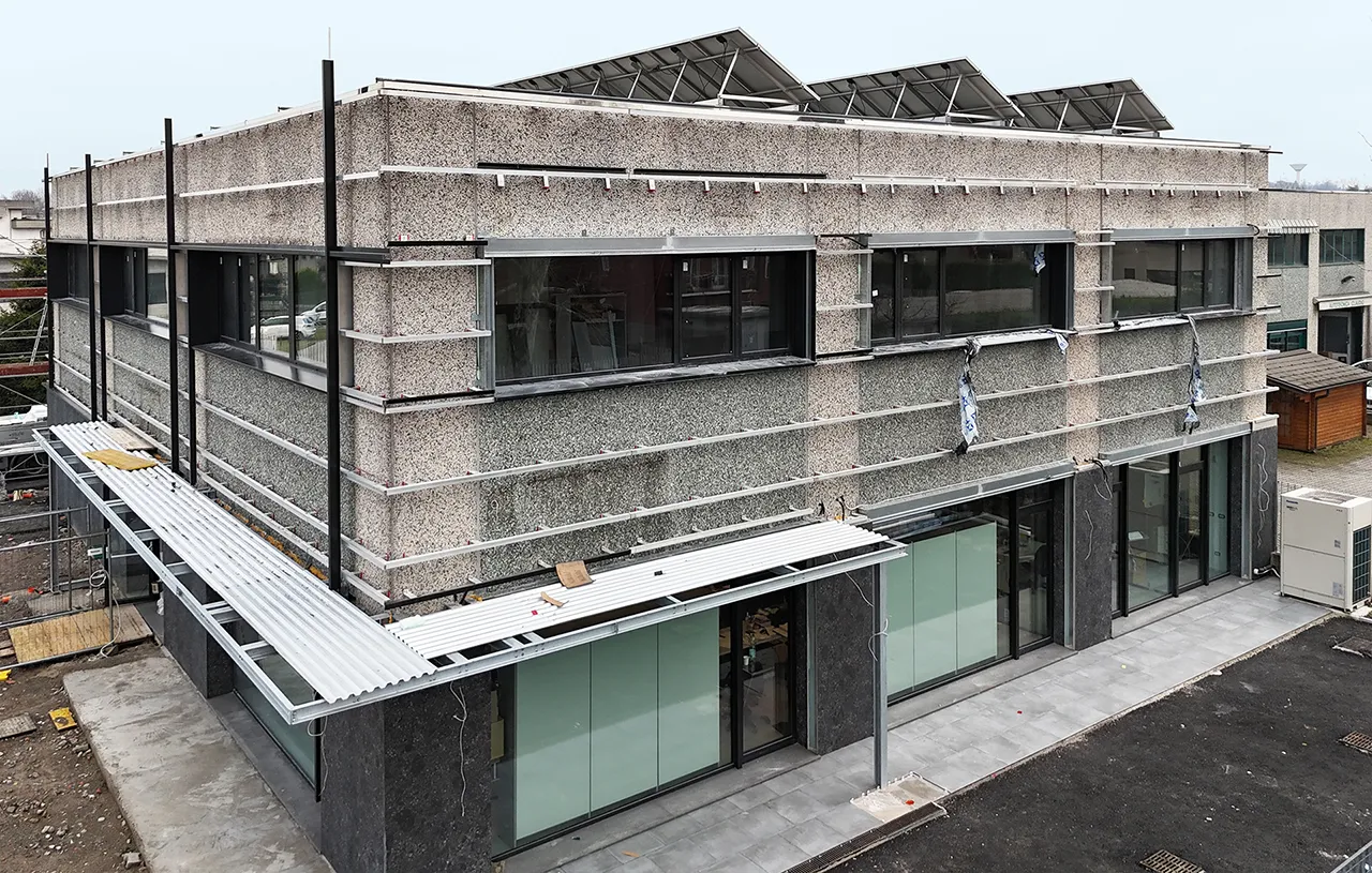 L’edificio, solido ma datato, necessitava di una completa ristrutturazione della facciata per renderlo contemporaneo e bello, dare una nuova immagine all’azienda e, allo stesso tempo, migliorare le prestazioni energetiche . Si è deciso quindi di realizzare una facciata ventilata su edificio esistente, capace di rigenerare l’immobile sia dal punto di vista estetico che prestazionale.