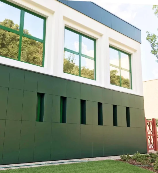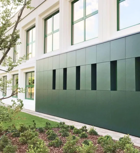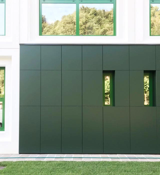 La palazzina uffici, di nuova costruzione, è stata rivestita attraverso la predisposizione della facciata ventilata: la scelta di struttura in alluminio, isolamento in lana di roccia e finitura con lastra Planea Swisspearl in cemento composito restituiscono modernità nell’aspetto ma anche nelle prestazioni isolanti.